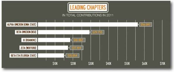 Last year, alumni of the Beta Omicron chapter were among the biggest supporters of the educational efforts of the Pi Kappa Phi Foundation. Of 226 total chapters, Beta Omicron was ranked 2nd in total contributions. Twelve alumni contributed $29,755 in support of educational initiatives of the Foundation in 2011.