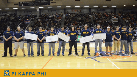 Student leaders from Pi Kappa Phi Fraternity’s Beta Omicron Chapter were recognized in front of a crowd of 3,000 fans at Northwestern State University’s basketball game Tuesday night. The Chapter and winners of the Pi Kappa Phi Foundation’s ‘Extra Mile” scholarship were called to half-court in Prather Coliseum during NSU’s game against Louisiana Tech on December 2.