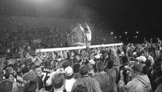 A mob of NSU fans tore down the goalpost at Turpin Stadium following the final home game of the 1997 season. (Photo courtesy: NSU Sports Information)