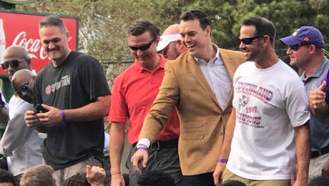 Rhett Crosby (pictured in tan-colored coat) rides in the NSU Homecoming parade with his 1997 Southland football champion teammates.