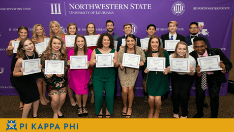 Recipients of the David D. Morgan Extra Mile Scholarship presented to members of Pi Kappa Phi are Blake Blanchard of St. Martinville, Colton Campbell of Coushatta, Jonathan Castillo of Bossier City, John Harrington of Center, Texas; Daniel Larin of Little Elm, Texas; Christian Rhodes of Gray and Char’Tarian Wilson of Shreveport.