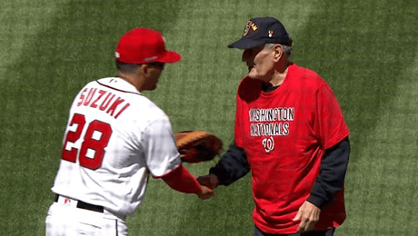 The 82-year-old graduate of Northwestern State University fired the ball across home plate, right into the mitt of catcher Kurt Suzuki, before a sell-out crowd of 42,263 fans erupted into applause.